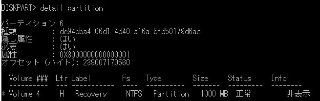 diskpart で、list disk, select disk 0, list partitionでパーティションを確認(今回はパティション6)。パーティションを選択し、IDと属性を上記で表示させた値で設定する。