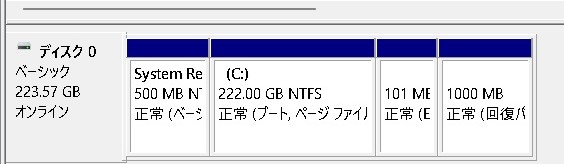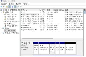 新SSDからwindowsを起動後、「ディスクの管理」を起動し、状況を再確認。